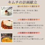 2週目〜3週目まで味が白菜に染み込み酸味が強くなりますのでキムチ鍋でお召し上がりください。